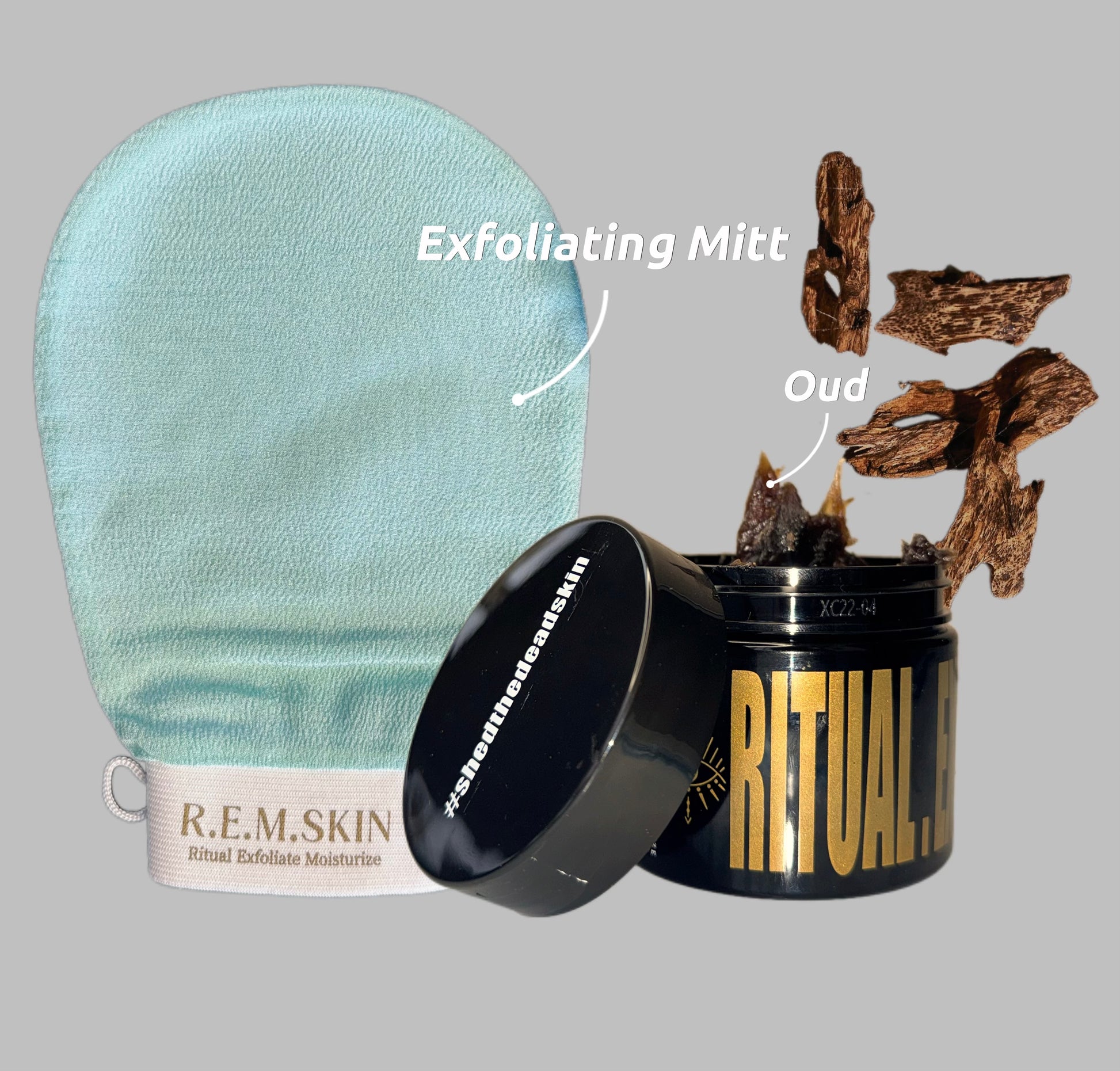 - Exfoliate, Use your damp R.E.M.Skin Exfoliating Mitt to scrub in long, circular & firm strokes. You’ll see dead skin peel off.