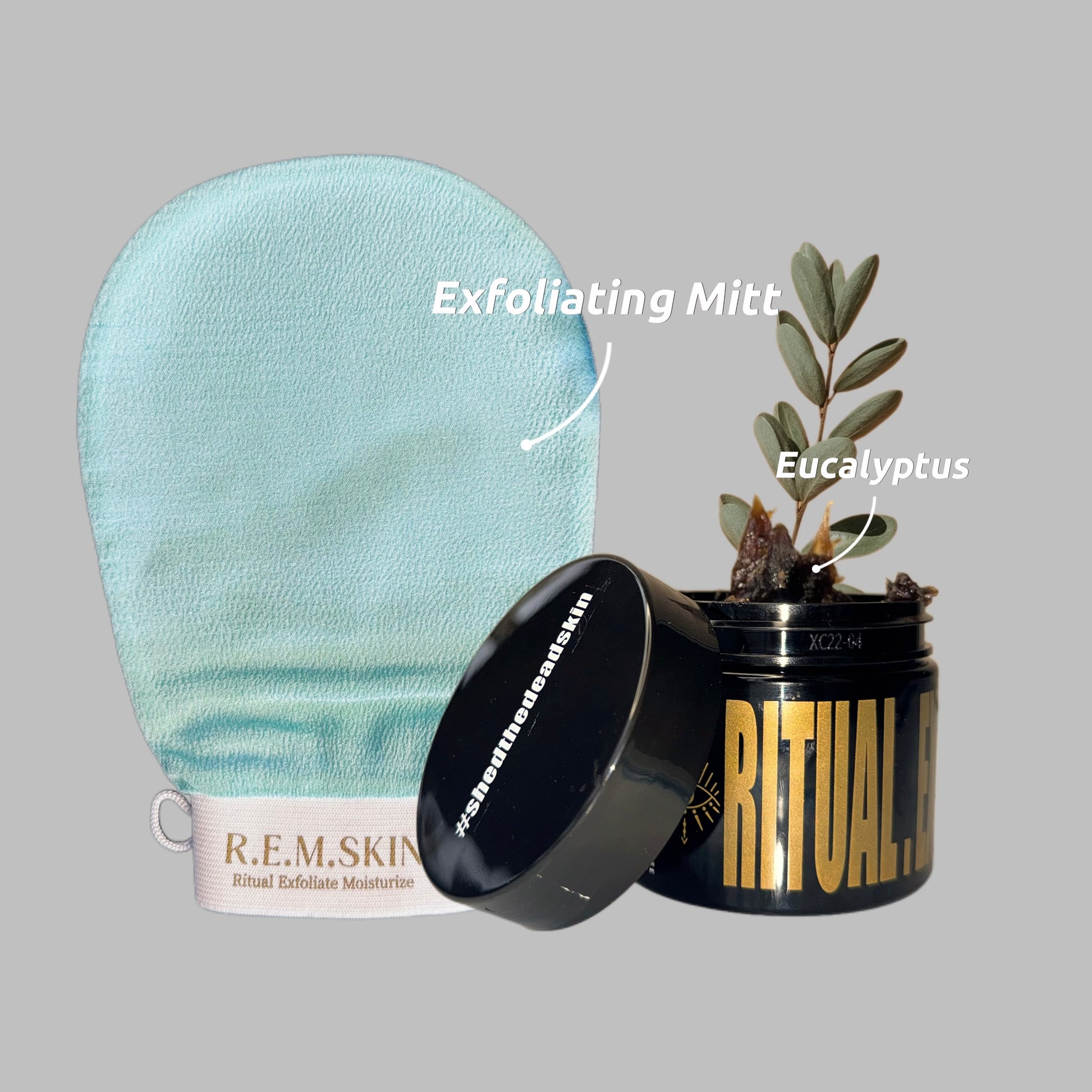 - Exfoliate, Use your damp R.E.M.Skin Exfoliating Mitt to scrub in long, circular & firm strokes. You’ll see dead skin peel off.